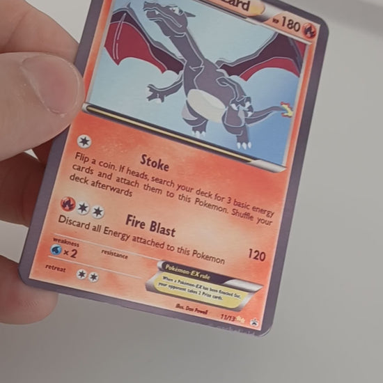 Custom digitally drawn Charizard illustration pokemon card printed on 0.5mm silver aluminum. These cards have unique designs drawn by our in house artists and have the stats and information from actual pokemon cards allowing them to be used as proxies. The cards are printed double sided with a pokeball printed on the back.