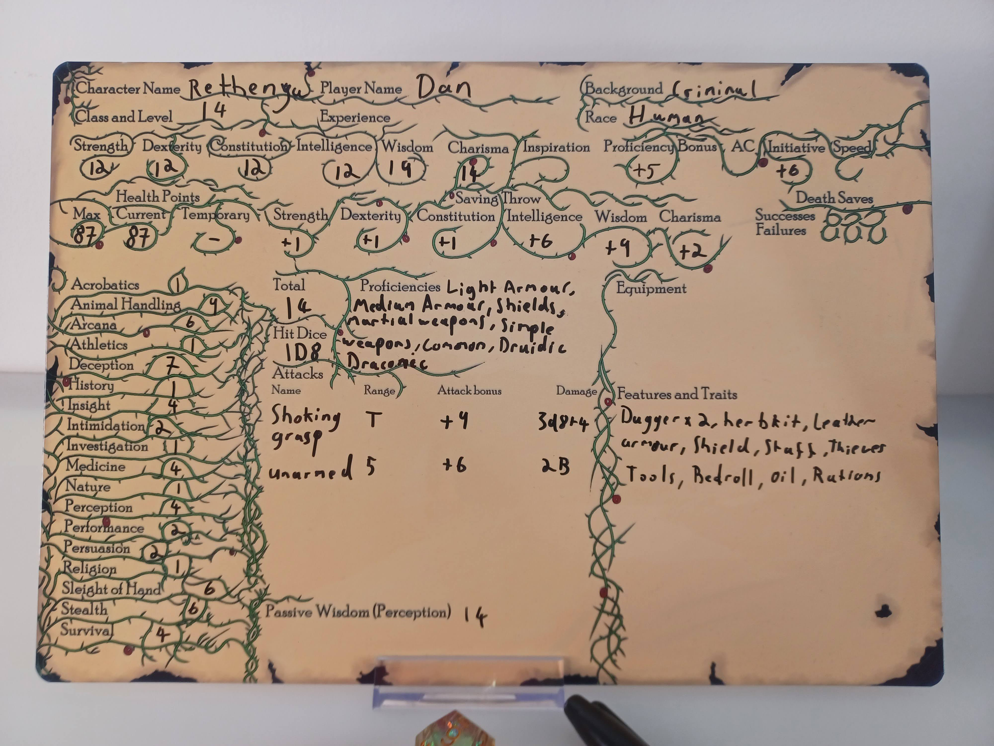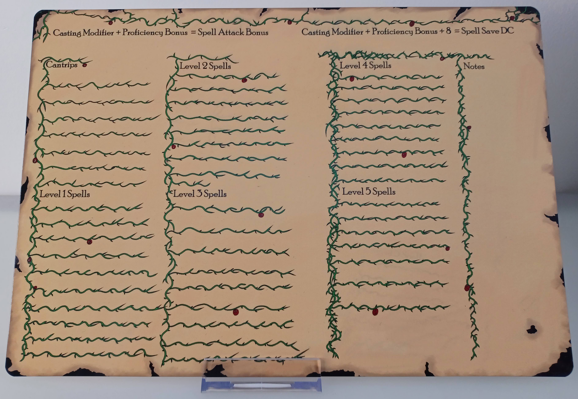 Perfect for any druid class or nature themed character, this dry erase double sided Character sheet is printed onto 0.5mm high gloss aluminum plate. Hard wearing, the sheet can either be filled in with standard or permanent markers for a longer lasting sheet. Permanent markers an be removed from these sheets with Isopropyl Alcohol or by drawing over the writing again in permanent marker which reactivates the original ink and can then be wiped off with a cloth.
