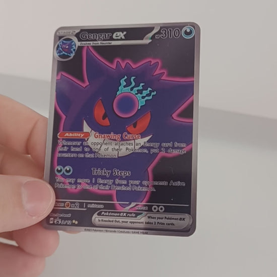Custom digitally drawn Gengar illustration pokemon card printed on 0.5mm silver aluminum. These cards have unique designs drawn by our in house artists and have the stats and information from actual pokemon cards allowing them to be used as proxies. The cards are printed double sided with a pokeball printed on the back.