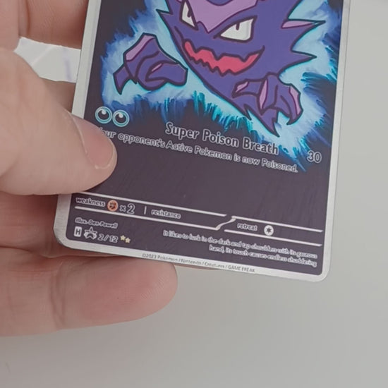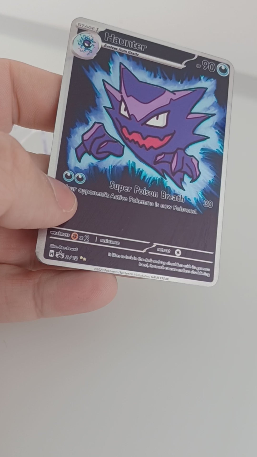Custom digitally drawn Haunter illustration pokemon card printed on 0.5mm silver aluminum. These cards have unique designs drawn by our in house artists and have the stats and information from actual pokemon cards allowing them to be used as proxies. The cards are printed double sided with a pokeball printed on the back.